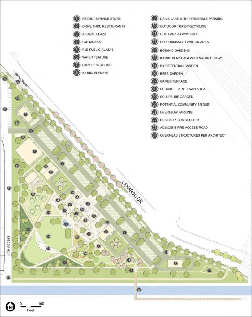 Specifically, the Carson Country Mart will include up to 10,000 square feet of commercial/retail uses, 12,600 square feet of restaurants (with drive-through capability), a 2,200 square foot walk-up café adjacent to the dog park and event lawn, and 9,000 square feet of food and beverage kiosks. The commercial/retail and restaurant uses within the Carson Country Mart may also include alcohol sales consistent with the requirements under the 2021 Specific Plan Amendment